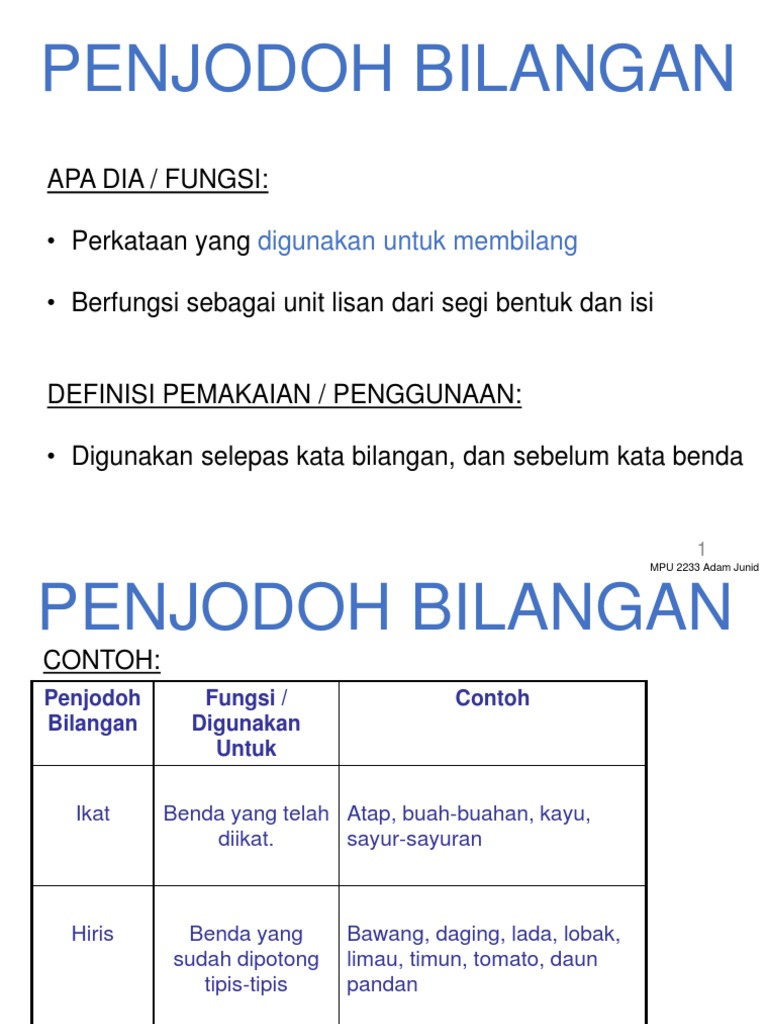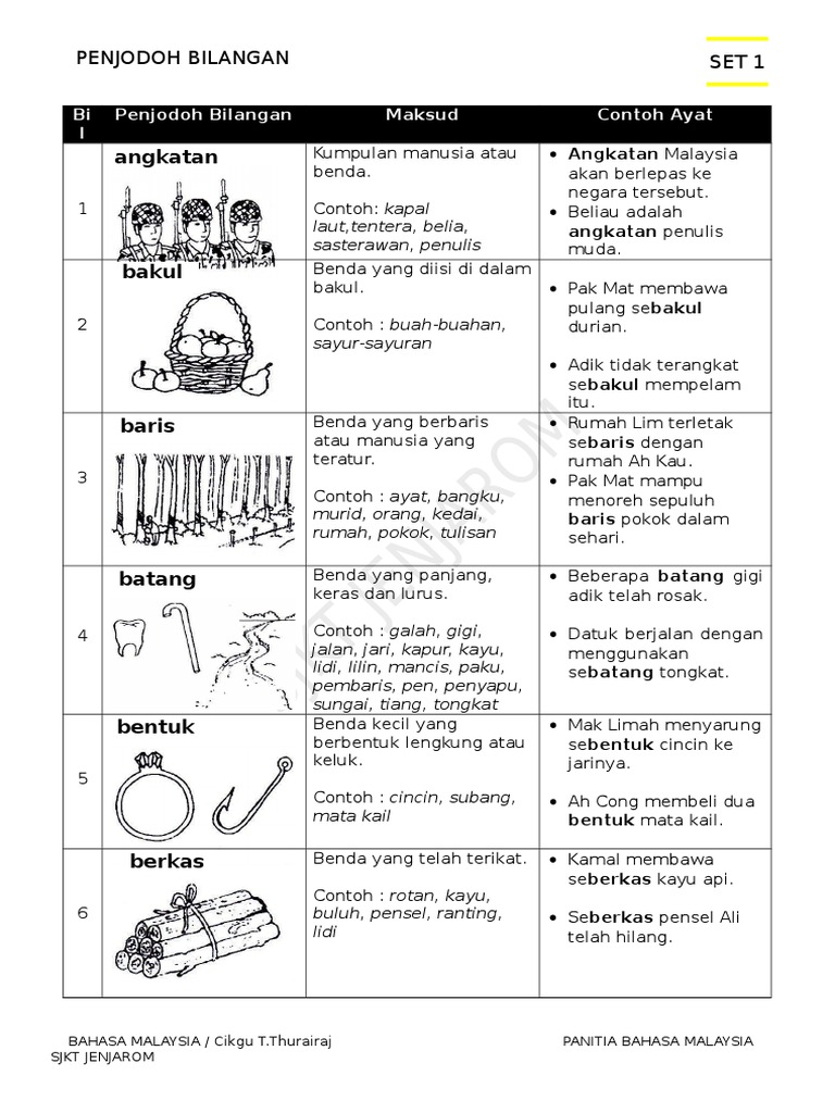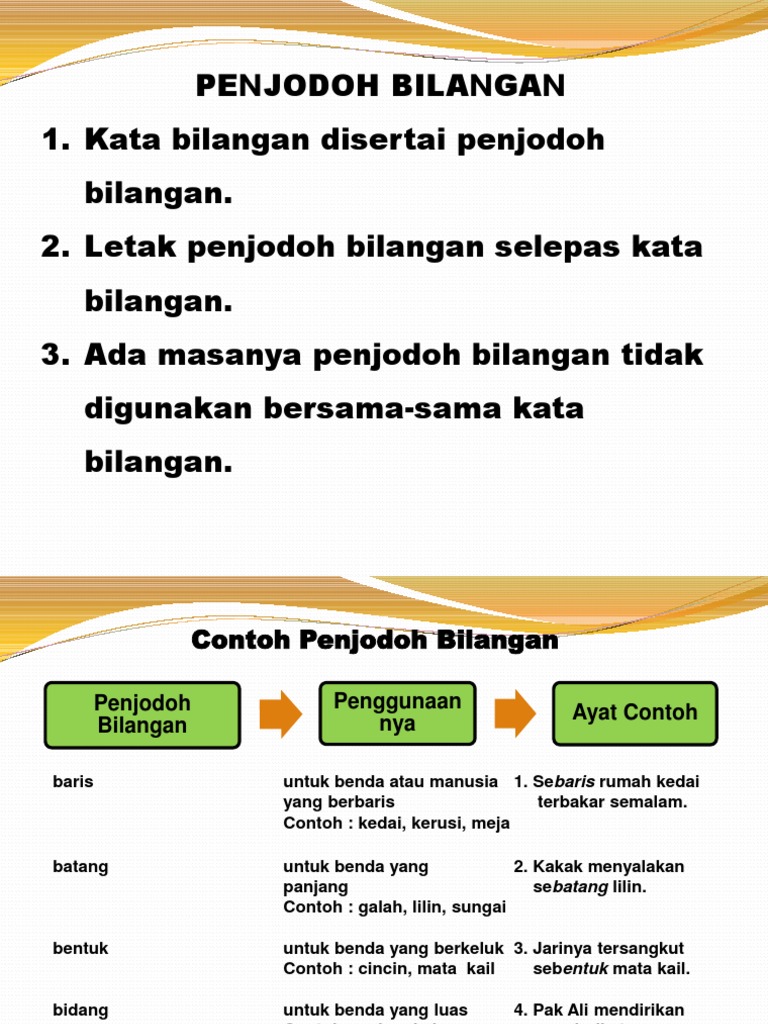Penjodoh bilangan digunakan untuk menentulkan sesuatu benda mengikut bentuk, rupa, saiz, dan sebagainya. Pelajar tahun 2 menaiki sebuah bas sekolah menuju ke kuala lumpur. Tentera, usahawan, sasterawan, belia, penulis. penjodoh bilangan penjodoh bilangan digunakan sebelum sesuatu kata atau nama yang menunjukkan jumlah atau bilangan. Penjodoh bilangan digunakan sebelum sesuatu kata atau nama yang menunjukkan jumlah atau bilangan.