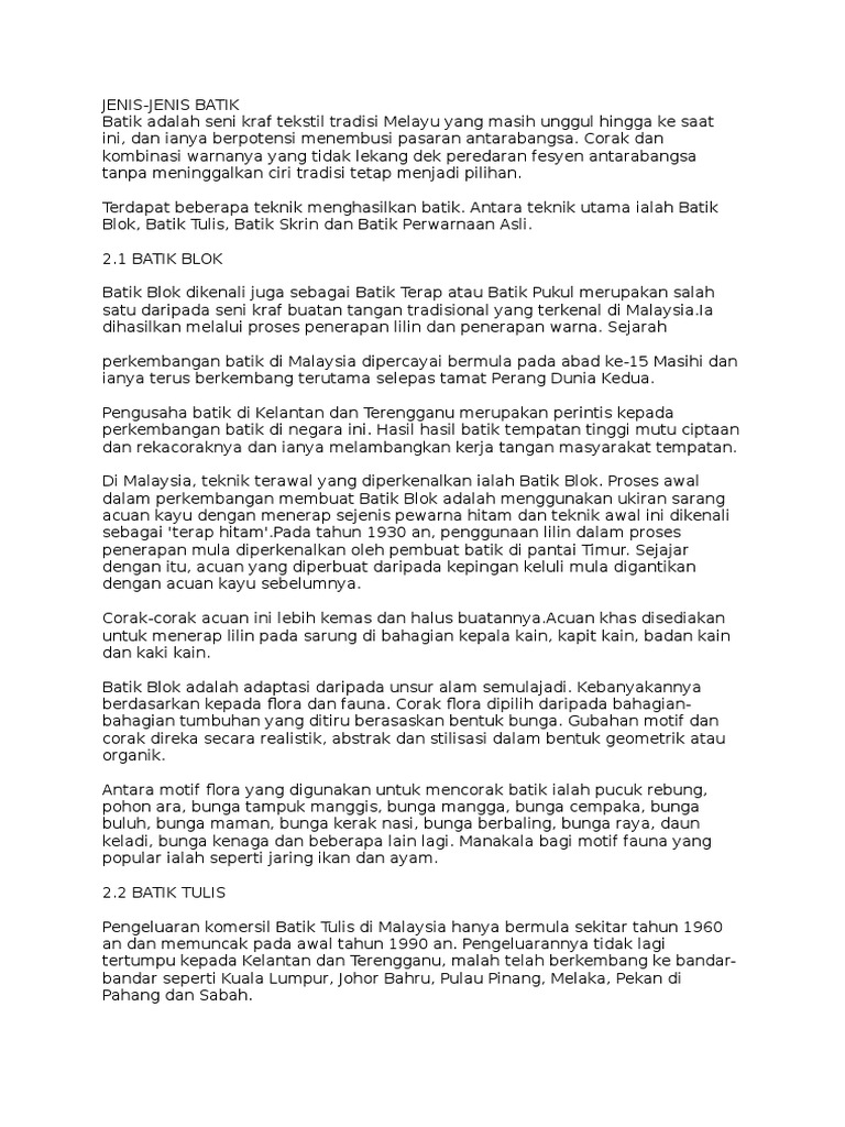 Doc Soalan Objektif Aini7490 Yaakob Academia Edu from 0.academia-photos.com Negeri yang popular dengan batik adalah kelantan dan terengganu. Batik tulis merupakan jenis batik yang pertama kali ada di indonesia. Jenis batik di indonesia ada berbagai macam sesuai daerah asal maupun dari ciri pewarnaannya. Ianya diperbuat daripada pelbagai jenis kain termasuk kapas, rayon, voile dan sutera. Dari keluarga melahirkan individu dengan berbagai bentuk kepribadian. Batik jenis ini berasal dari daerah jawa, lebih tepatnya yogyakarta. Dari sekian banyak jenis madu tersebut, sebagian besar hanya diproduksi oleh beberapa jenis lebah. Tiap motif batik juga memiliki sejarahnya sendiri.